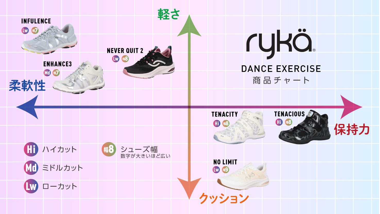 この度、rykaダンスエクササイズシューズの各モデルの商品チャートを作成致しました。